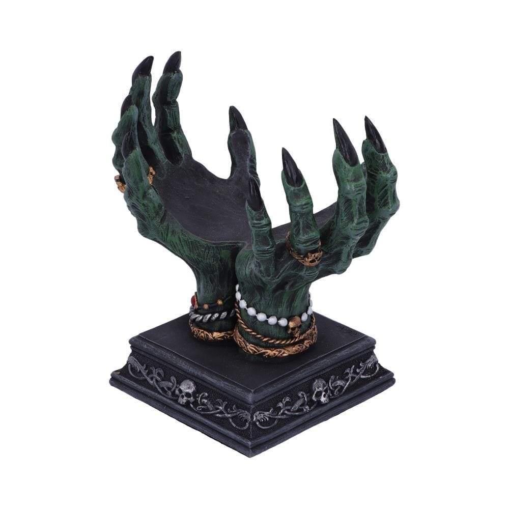 Beyond The Grave Crystal Ball Holder stands on a matte black base, two cupped zombie hands can be seen emerging from their grave. Ready to grasp onto your crystal ball. Decorated with a selection of jewellery and gothic patterns, this piece truly is show-stopping. Cast in the finest resin before being expertly hand-painted, this piece makes the perfect addition to any gothic collection.