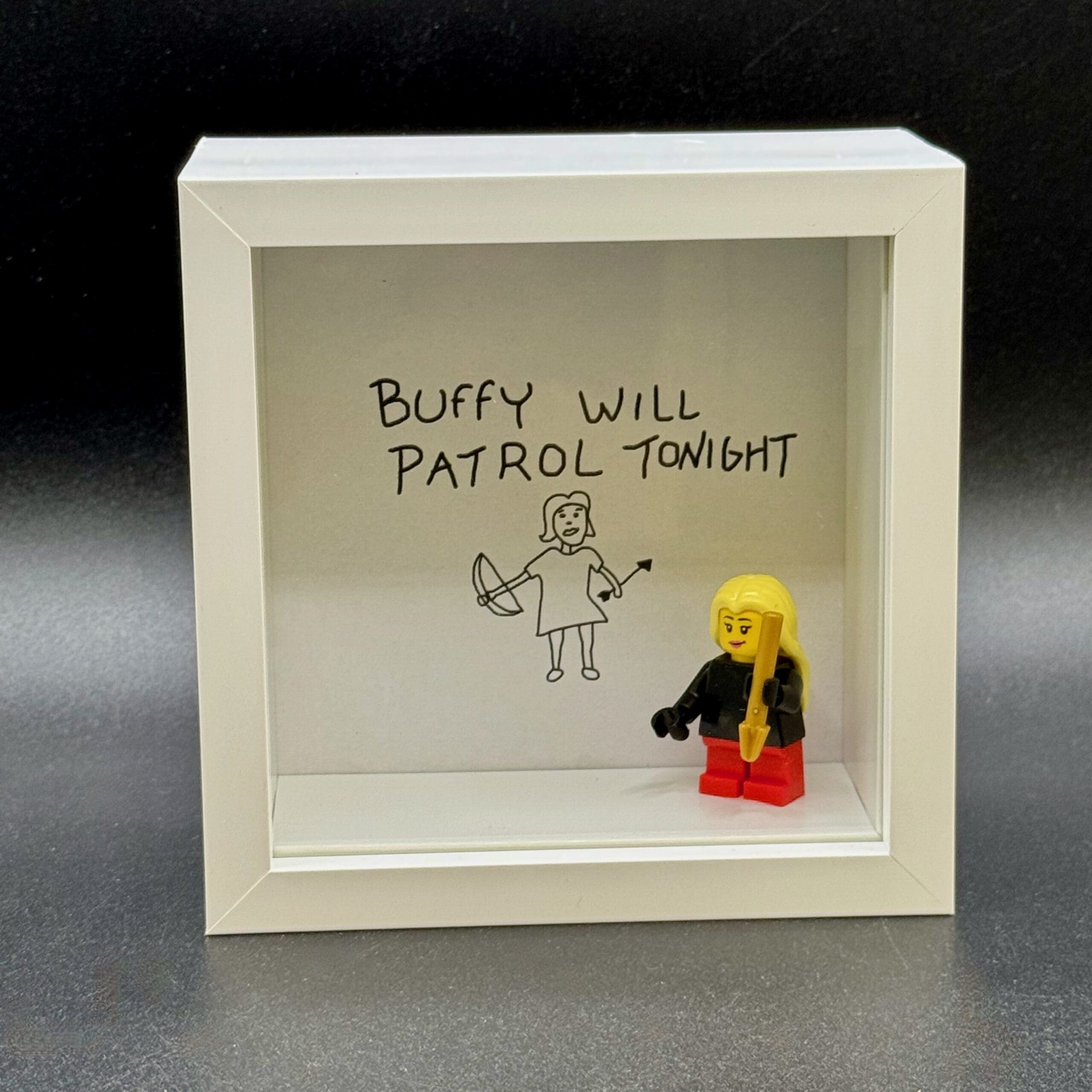 Presented in a clean, modern 4×4 inch white box frame, this piece features a custom-designed Buffy minifigure, prepared for her nightly duties. The iconic quote, “Buffy will patrol tonight,” is printed on a high-quality background, making this a standout piece of geek wall art for any room, home office, or dorm.
