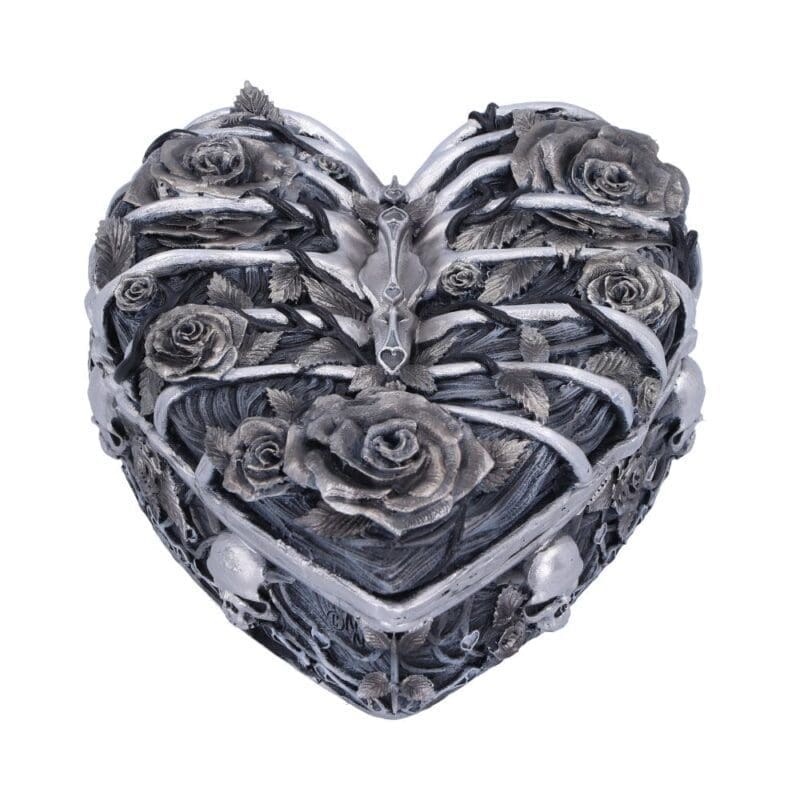 Keep your most prized possessions safe with this gothic style Caged Heart Box. Shaped like a heart with a removable lid to reveal the compartment, this box is covered grey roses and small leaves with silver skulls around the outside, all encapsulated by a cage. Cast in the finest resin before being expertly hand-painted, this Caged Heart Box will make the perfect gothic gift.