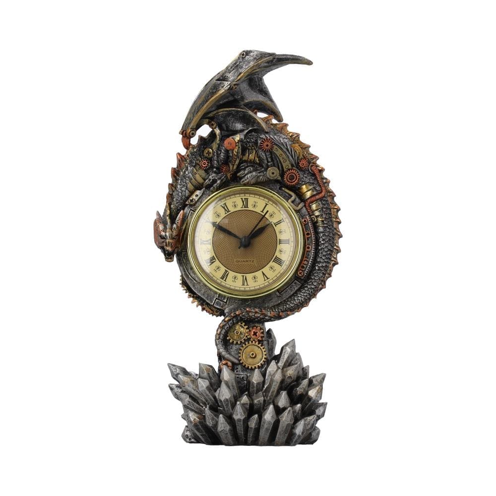 Take control of your time with this fantastic free-standing clock from alternative brand Nemesis Now’s giftware collection. Rising from a cluster of dark grey crystals, the Clockwork Reign clock is guarded jealously by a clockwork Dragon, bronze cogs and brass rivets sitting on top of their steel scales. Tail curled around the clock possessively, they snarl at you, wings raised in a threat display. Cast in high-quality resin before being painstakingly hand-painted, this majestic clock can adorn any mantelpiece.Requires 1 AA battery
