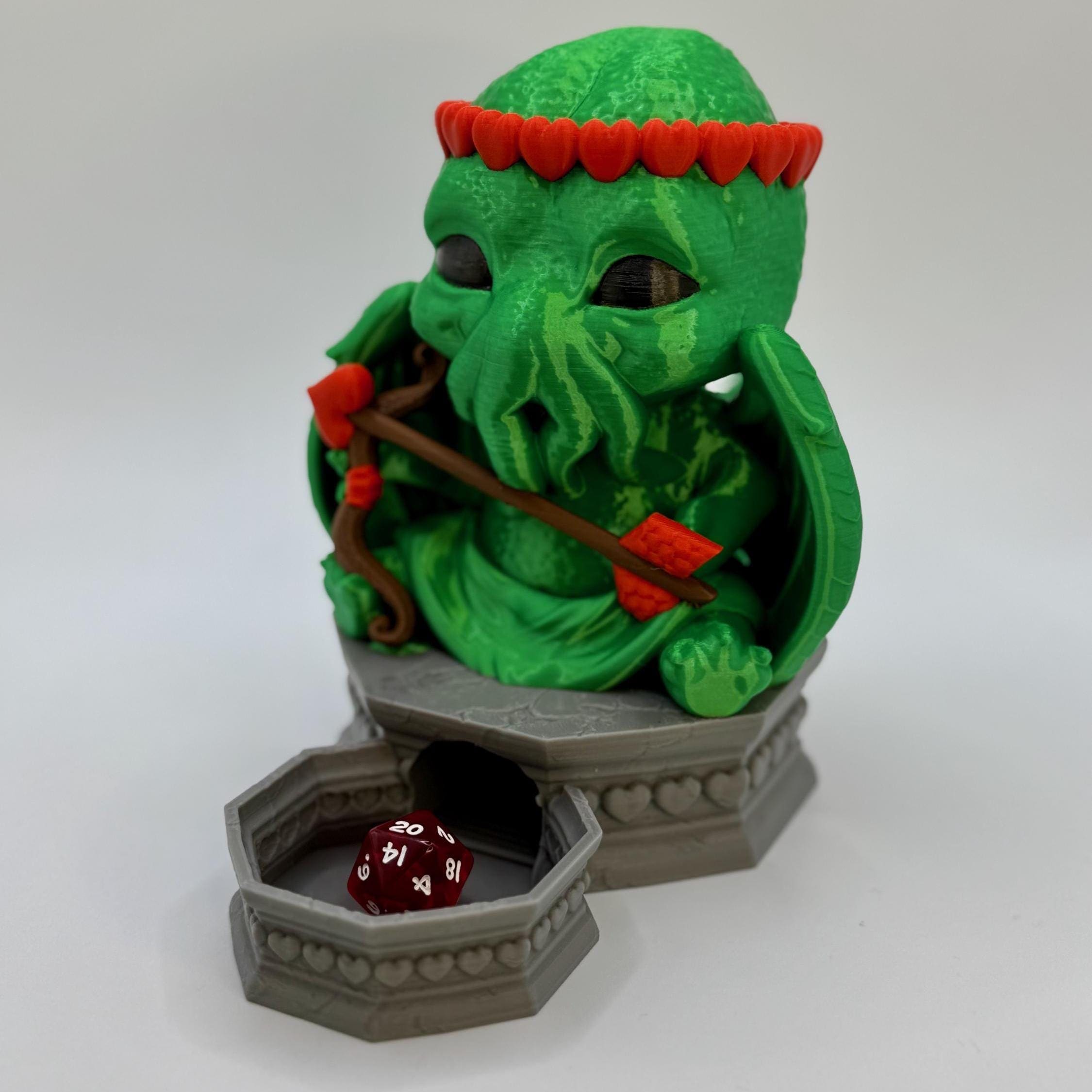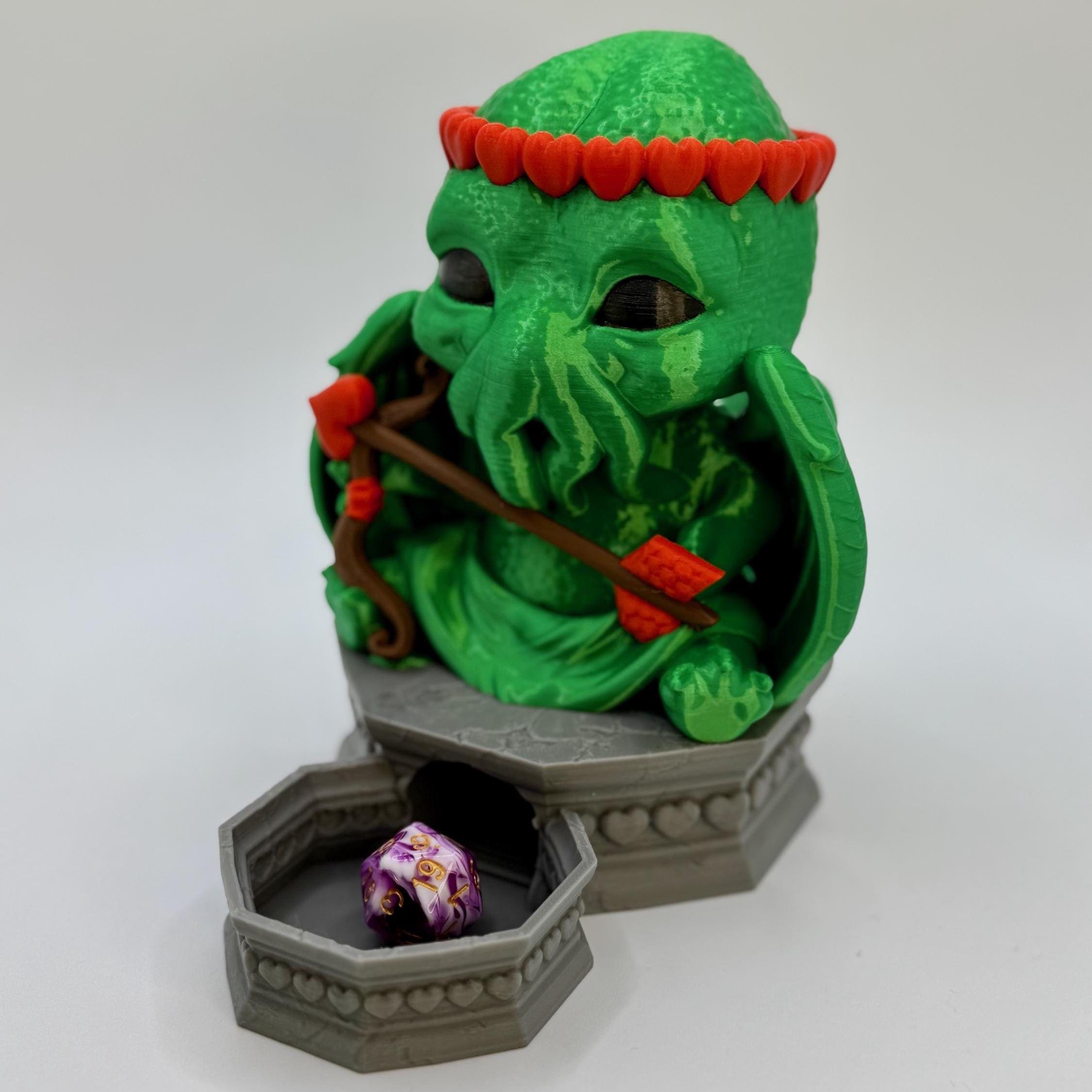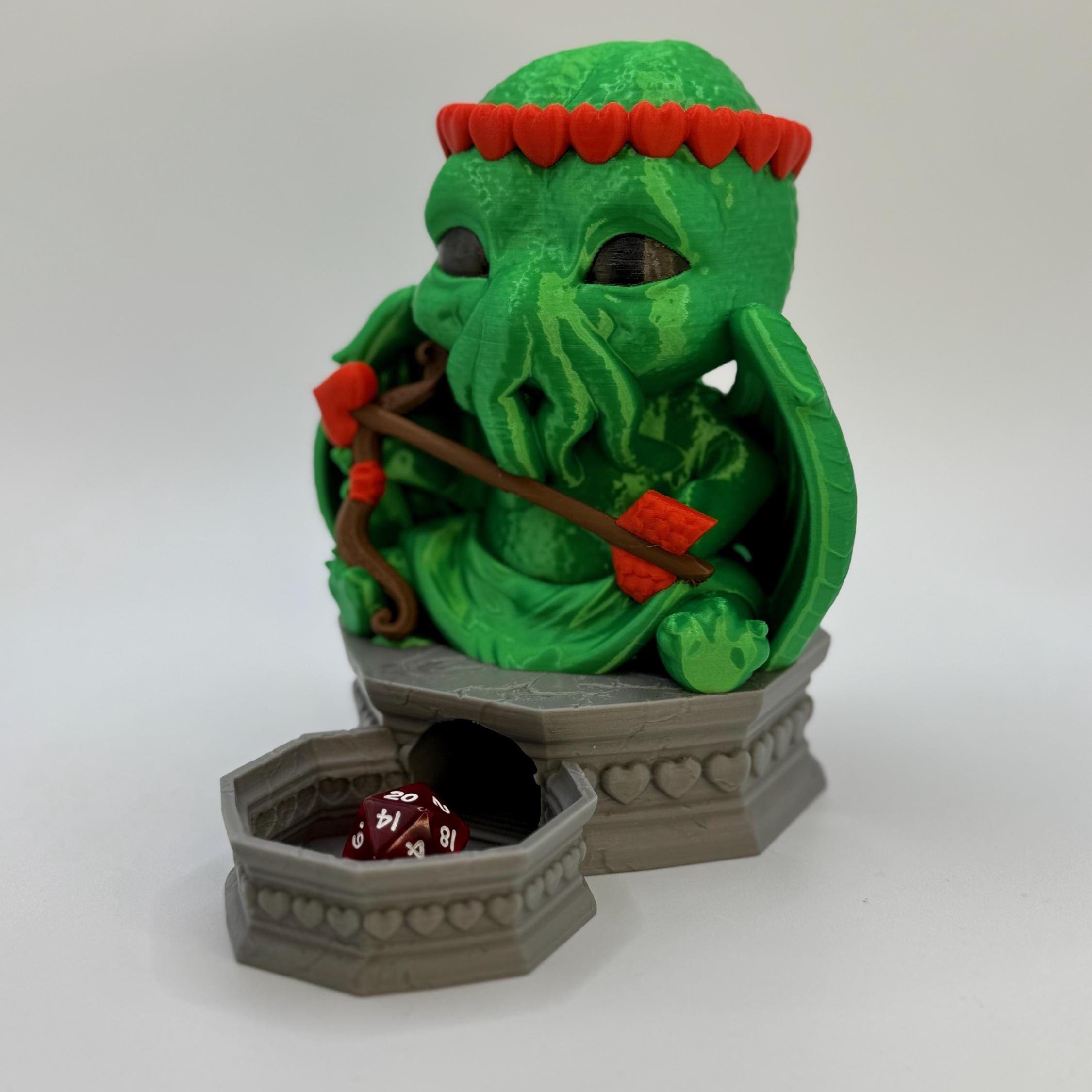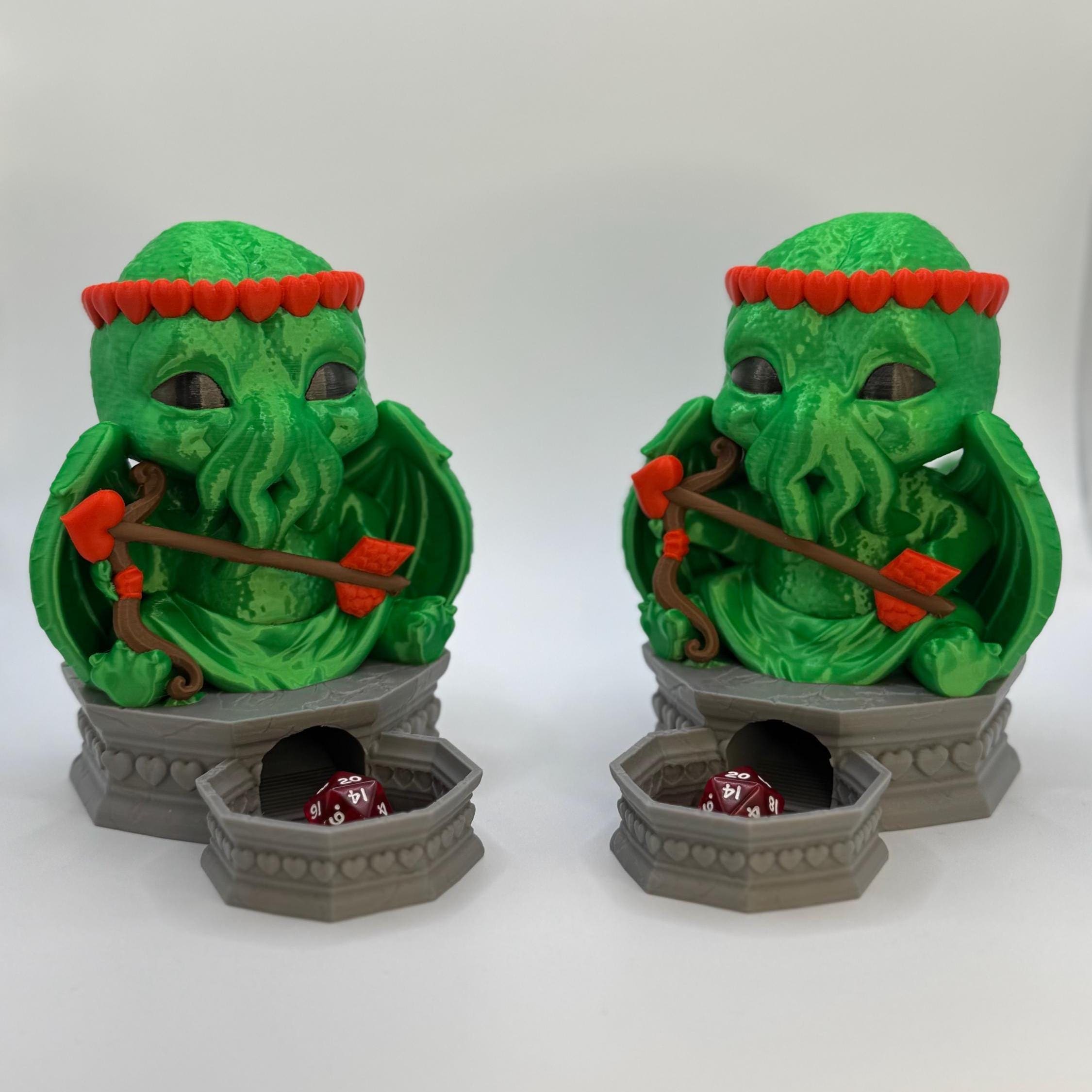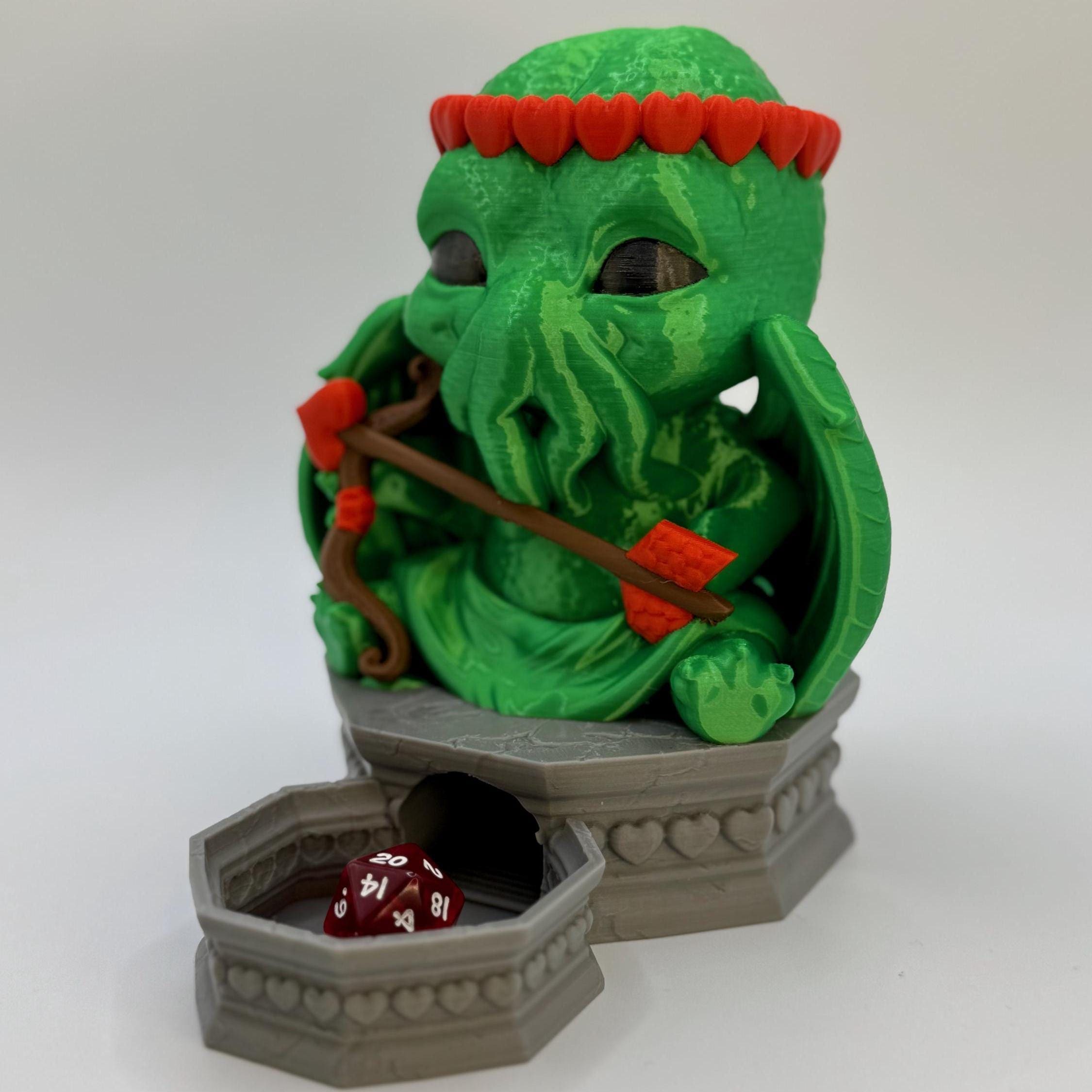 Enhance your tabletop gaming with the 3D-printed Cthulhu Cupid Dice Tower – a perfect fusion of eldritch horror and romantic whimsy! This intricately designed dice tower features Cthulhu as a mischievous cupid, delivering precise dice rolls while adding a unique gothic charm to your game sessions. Ideal for RPG enthusiasts and collectors alike, this functional art piece makes a great gift or conversation starter. Level up your dice rolls in style! Guarantees maximum randomness for your rolls.