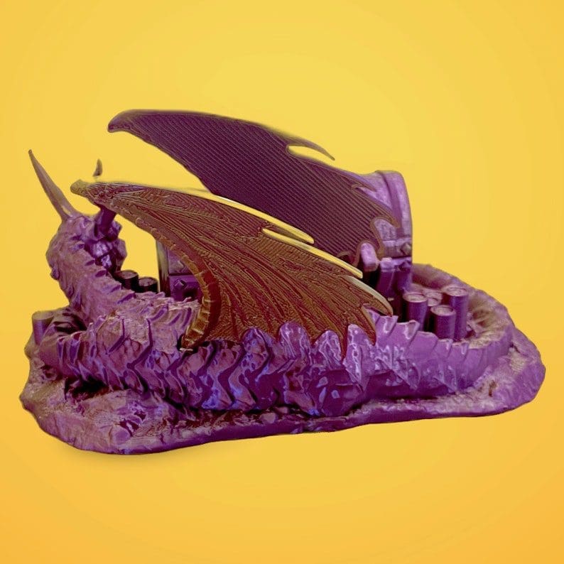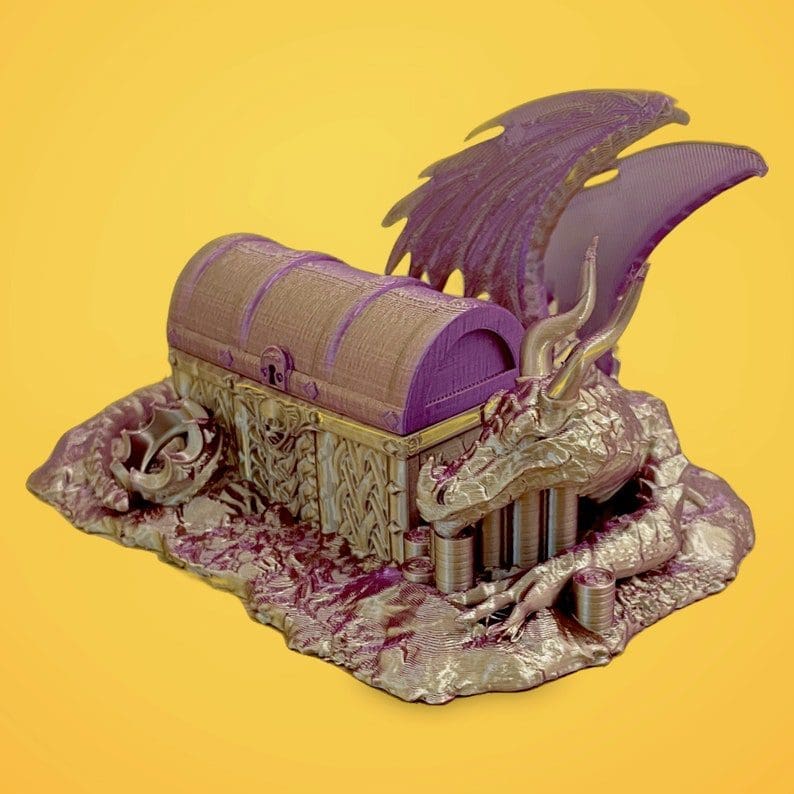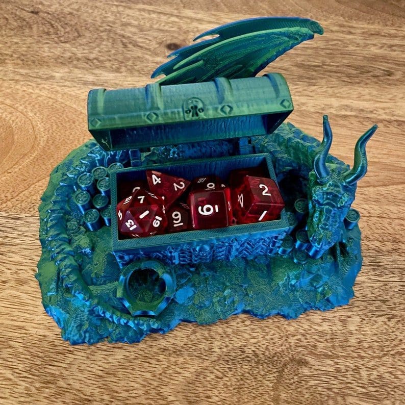 Keep your dice safe and secure with our dragon hoard dice jail! This 3D printed dice jail is designed to resemble a treasure chest or a dragon’s lair. It is perfect for your next DnD session or as a terrain part for your miniatures game.