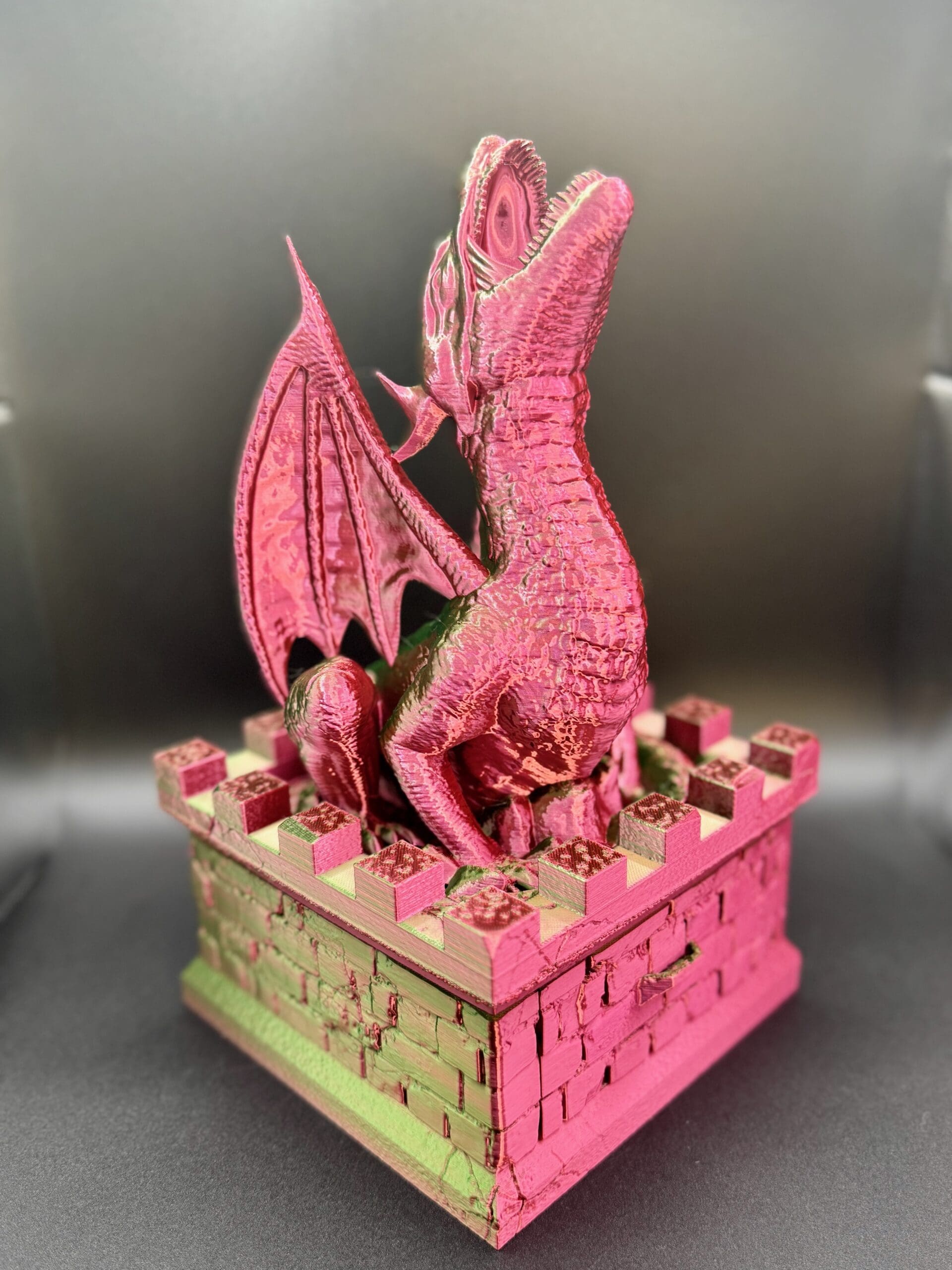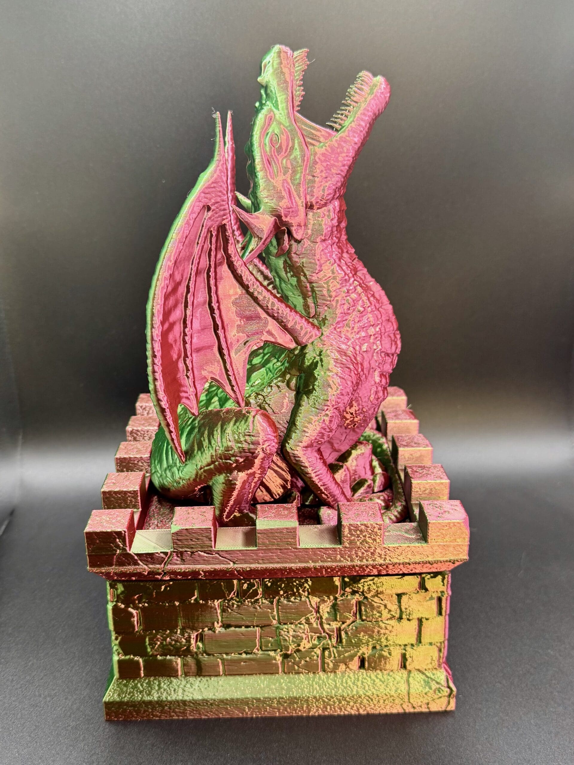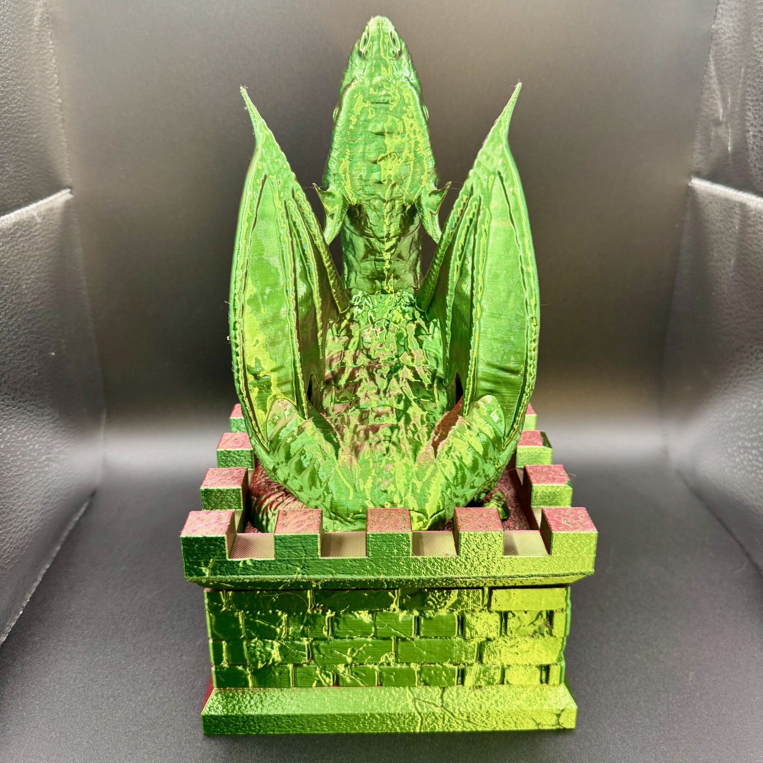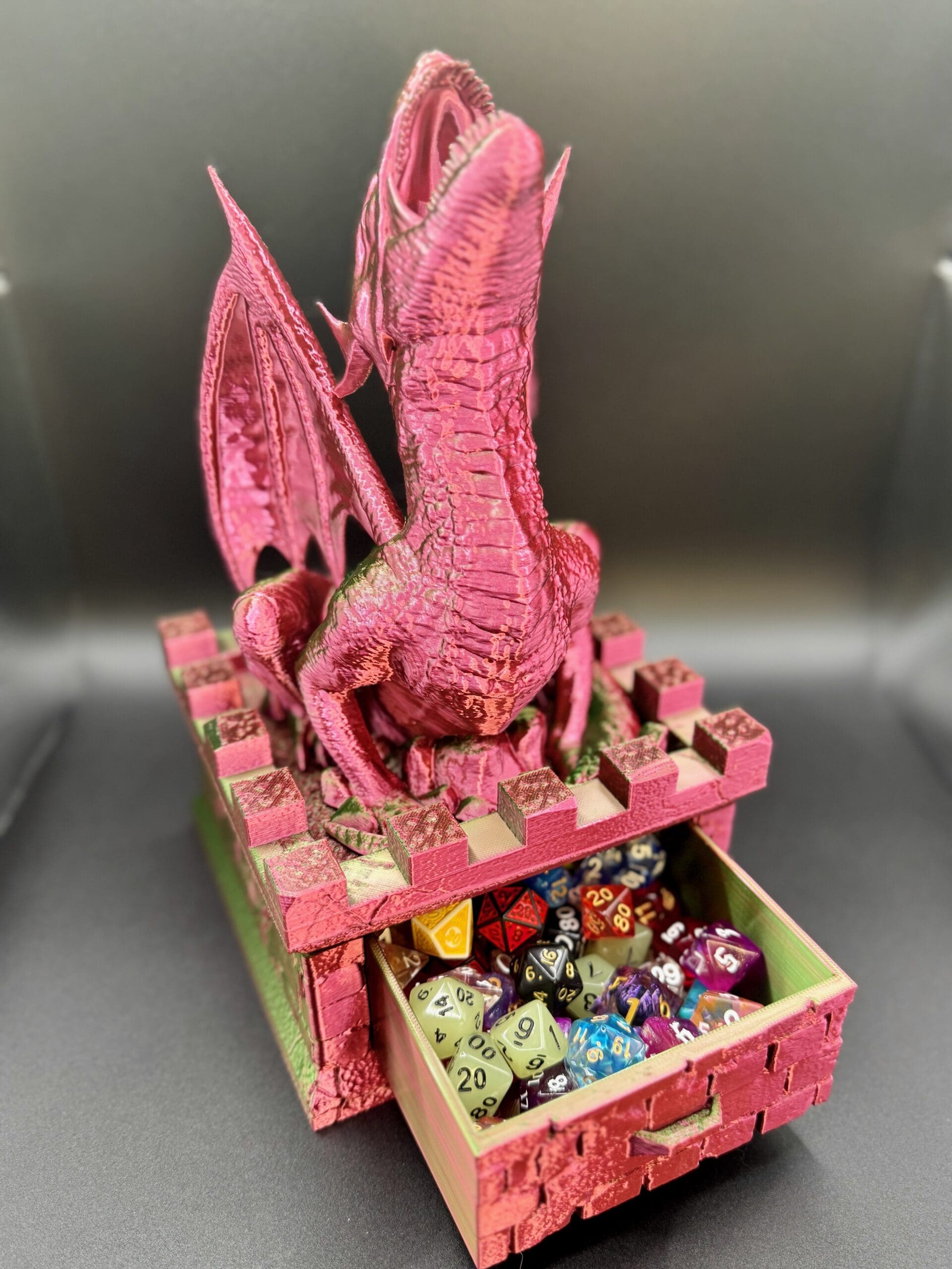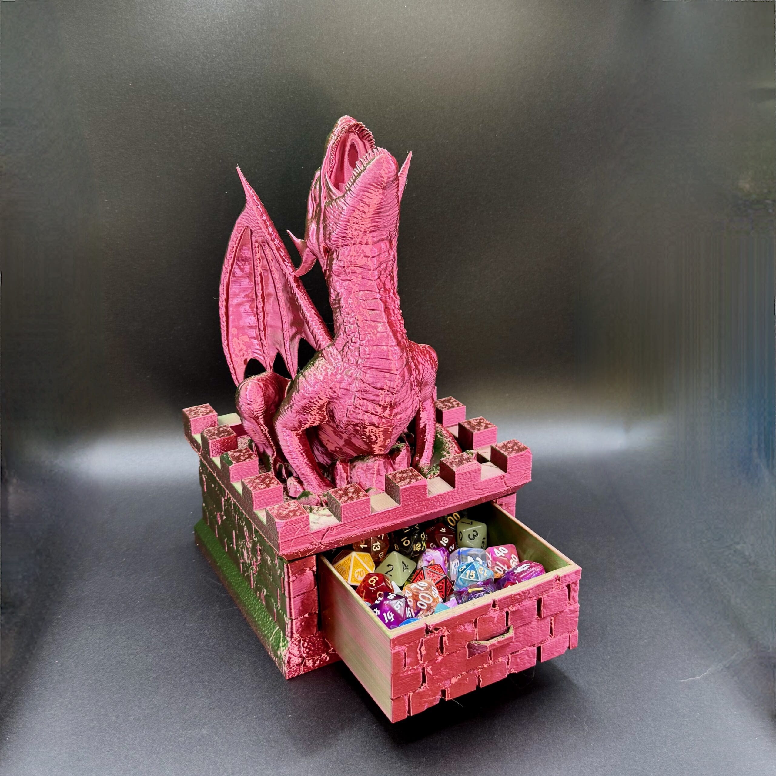 Unleash the power of the Dragon Vault! This intricately designed dice tower features a majestic dragon perched atop a craggy spire, guarding your most valuable treasure—your dice. Crafted for style and function, it includes a smooth-rolling dice tower chute and a hidden drawer for storing your polyhedral dice sets.