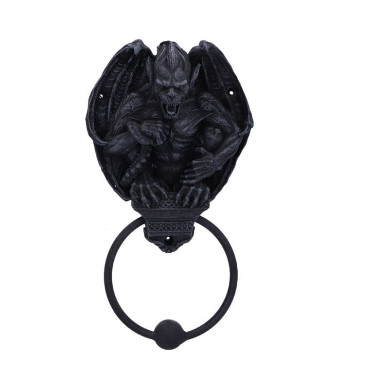 Clinging to the walls of Castle Nemesis is this Grotesque Greeting Door Knocker. Crouching down low, whilst their muscular arms steady them high above the ground, they frown, mouth open wide in a threatening display. They have skeletal webbed liked feet and fierce torn wings which engulfs their back. Cast in the finest resin before being expertly hand-painted, the knocker part is a solid metal ring, weighted to provide a loud knock. A perfect addition to any gothic home.