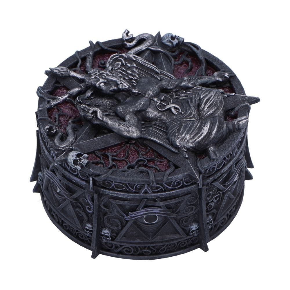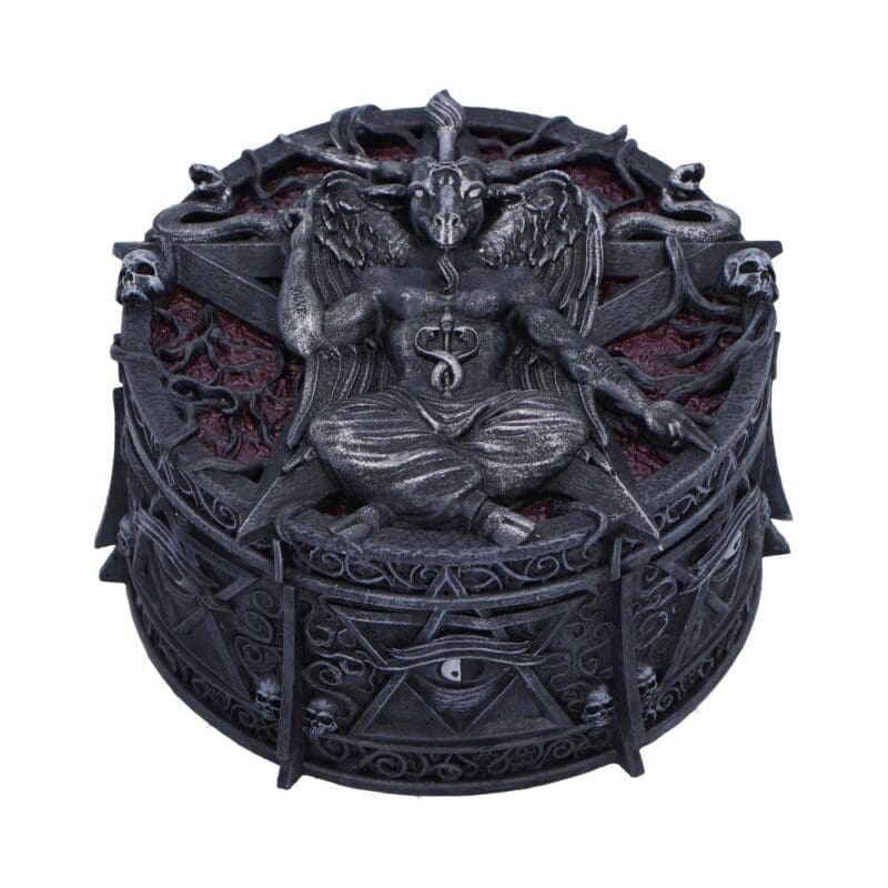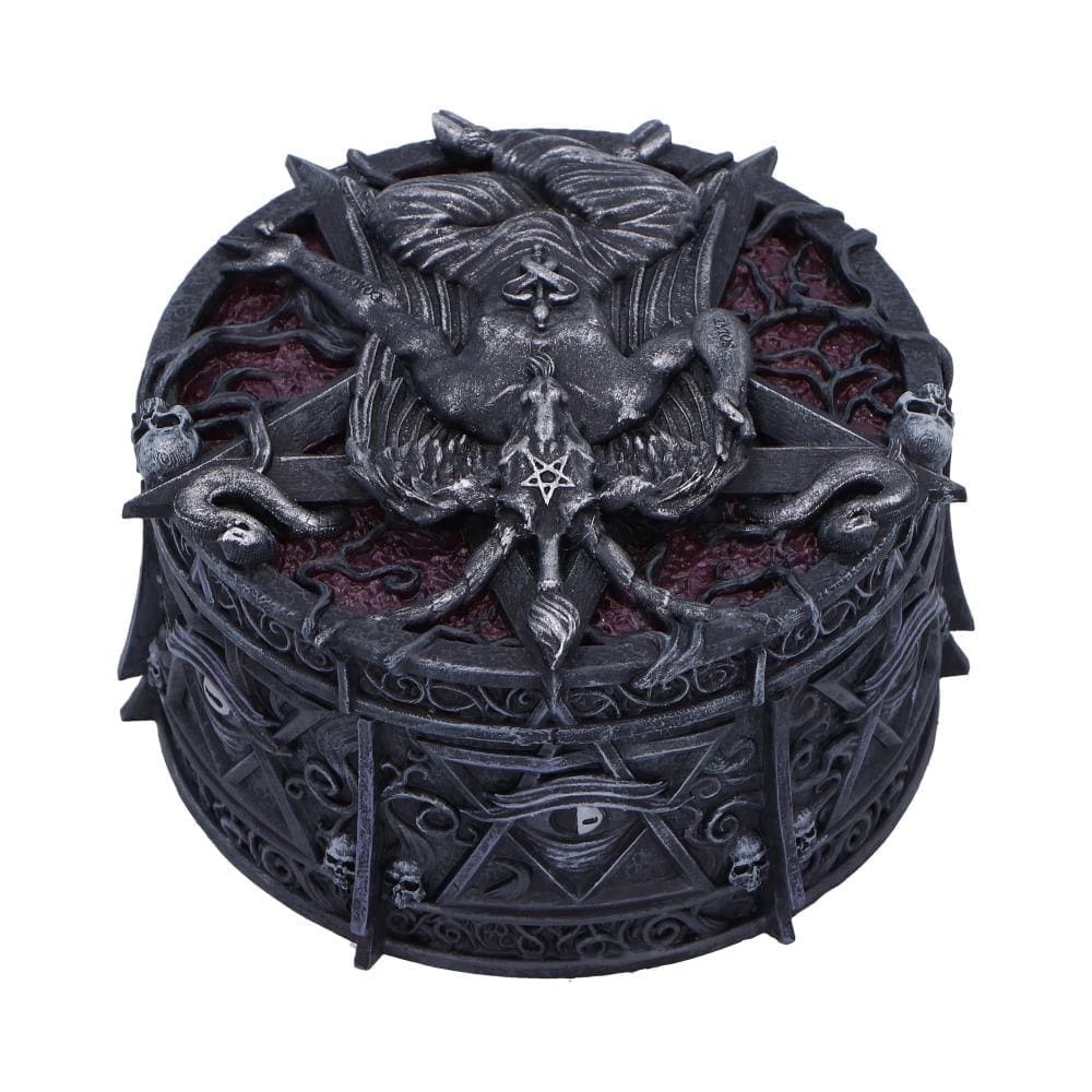 Unveil the mystique with the “Hoard of the Baphomet” trinket box by Nemesis Now. This exquisite round box features a commanding Baphomet on the lid, encircled by serpents, skulls, and arcane symbols, all cast in high-quality resin and meticulously hand-painted to capture every detail. Deep enough to safeguard your most cherished treasures, it offers both practicality and a touch of gothic grandeur. Perfectly packaged in a Nemesis Now branded gift box, it makes an exceptional gift for enthusiasts of the occult and collectors of the macabre. Elevate your decor with this stunning fusion of art and utility.
