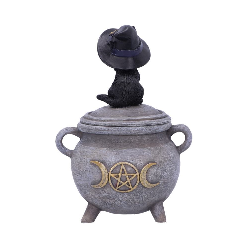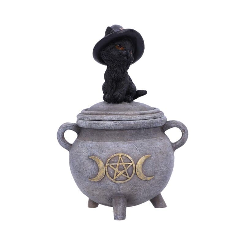 This Witch Cat Cauldron Box features a cute little cat sitting peacefully on top of a cauldron, the Tripe Moon symbol on the front. Perfect for keeping all your trinkets safe, cast in the finest resin before being expertly hand-painted this Witch Cat Cauldron Box would make a great gift for any lover of witchcraft.