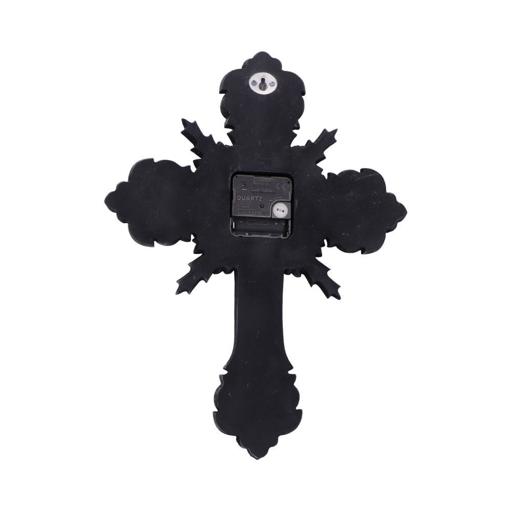 Shaped like an ornate cross, the clock features intricate silver detailing that highlights its gothic-inspired design. At its heart lies a central clock face, beautifully adorned with a winged skull—a powerful and eye-catching symbol. This striking design serves as a constant and dramatic reminder that “every hour counts.”