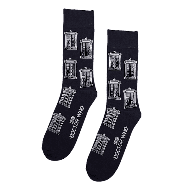 Step into another dimension with these Official Doctor Who TARDIS Socks! The perfect gift for any Whovian, these comfortable crew socks feature a detailed, all-over “Multi-Tardis” pattern against a classic navy blue.