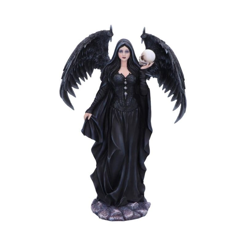 Gothic angel figurine in dark teal and black. Dramatic winged design with skull motif. Intricate costume and wing detailing. Premium resin construction. Ideal for gothic art collectors and dark fantasy enthusiasts.