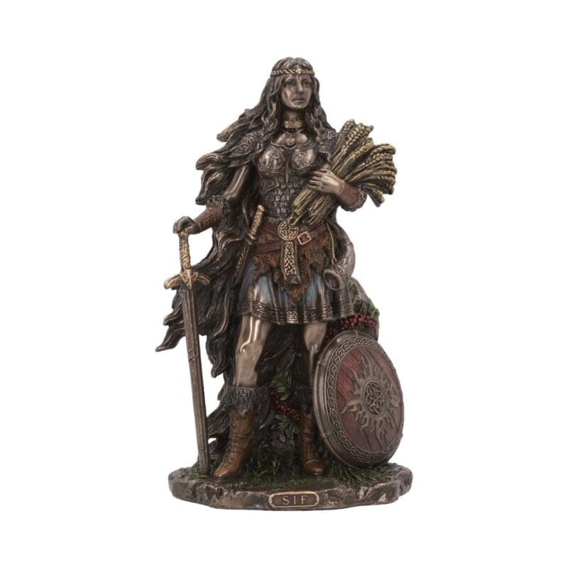 Known as the Norse Goddess and wife of the warrior god Thor is Sif. She was the goddess of wheat, fertility and family and her most famous physical attribute was her long golden hair which flows down her back. This Sif Goddess of Earth and Family figurine shows her standing strong dressed in viking armour, sword in one hand and wheat in the other. Cast in the finest resin before being expertly finished in bronze, this figurine will make the perfect addition to any viking or mythology collection.