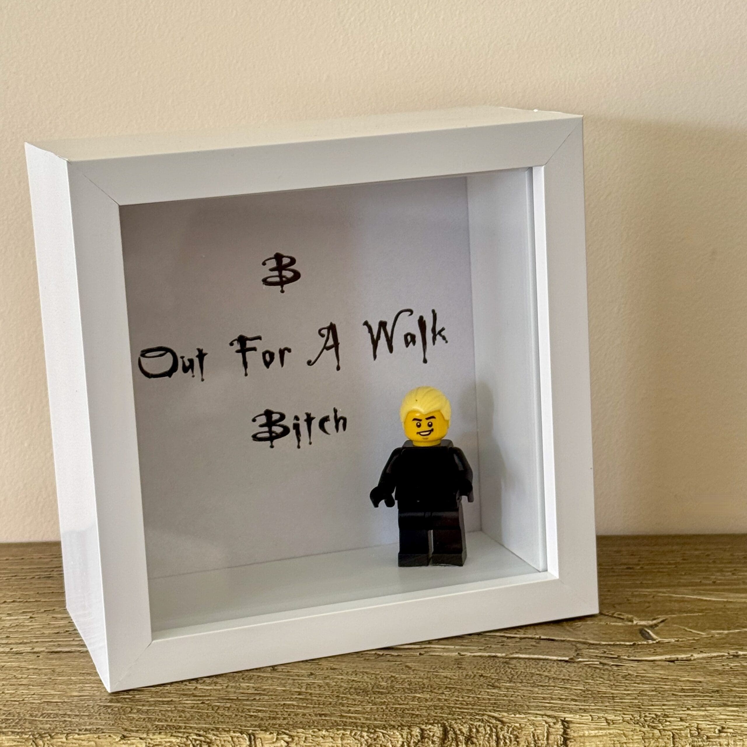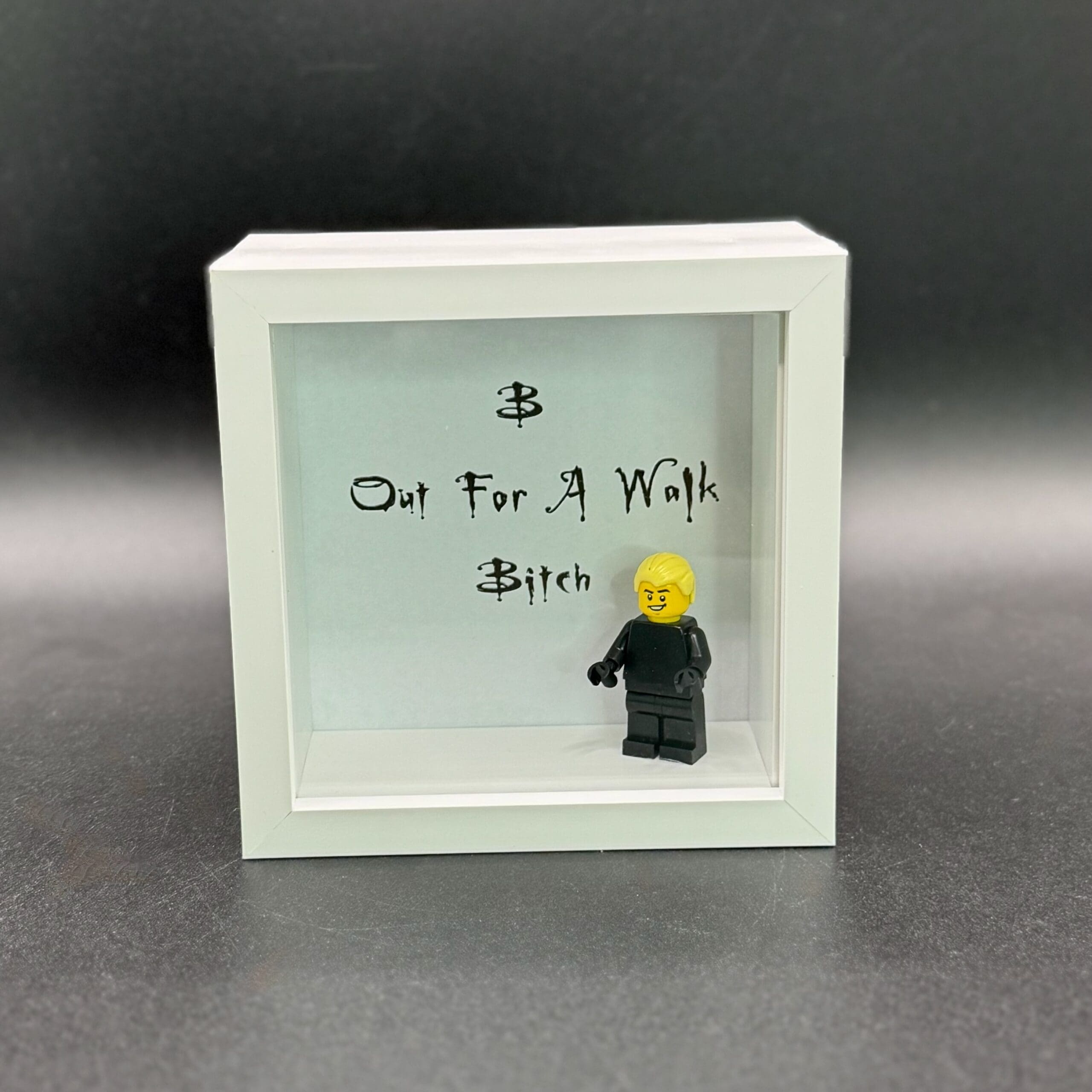 This piece features a detailed minifigure of the character in a 4×4 inch display frame, perfect for adding a touch of rebellious style to any room. It’s the ideal piece of geek wall decor for your desk or shelf. Behind the figure is one of his most infamous lines: “Out for a walk… bitch.”