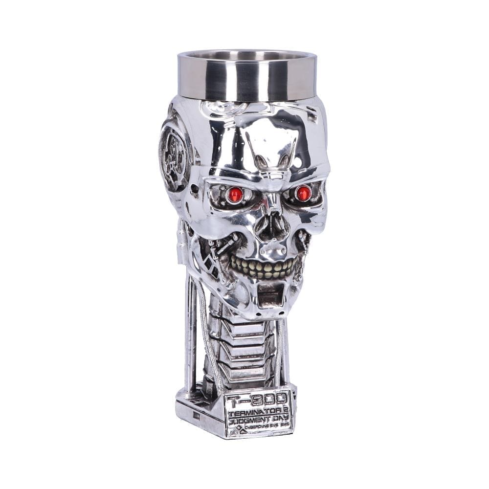 Sent back in time from the future, this officially licensed goblet was created by alternative brand Nemesis Now. This T-800 Terminator head has shed all human flesh, exposed hydraulics overlaid on a metallic skeletal structure that mocks humanity. Red eyes stare straight ahead unblinkingly. Cast in the finest resin before being carefully hand-painted, this features a removable stainless steel insert for ease of cleaning. The perfect way to keep your home safe from the android menace.