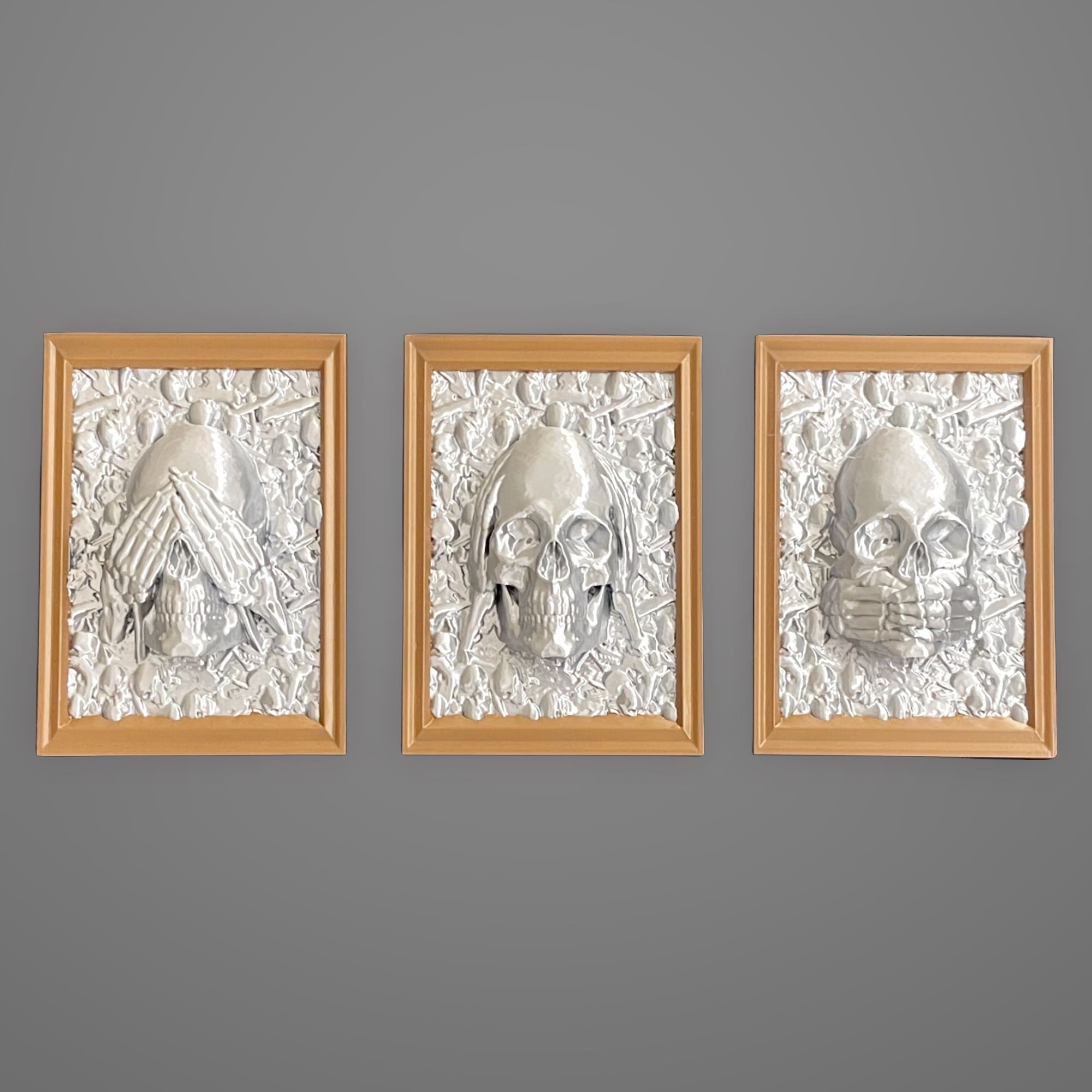 Embrace a timeless proverb with our striking Three Wise Skulls Wall Art. This captivating 3D printed wall hanging serves as a powerful piece of gothic home decor, embodying the classic principle, “see no evil, hear no evil, speak no evil.”