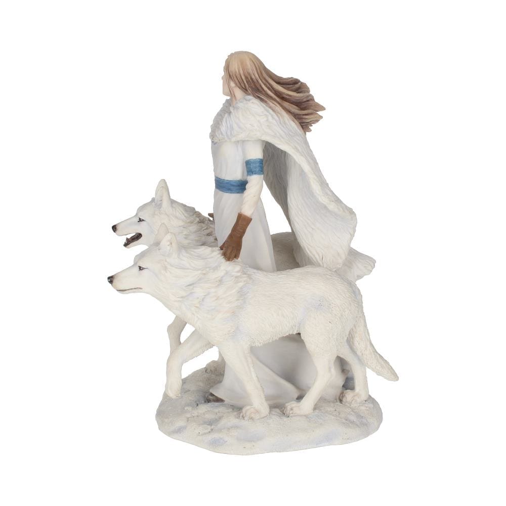 From the enchanted mind of globally renowned Gothic and Fantasy artist Anne Stokes, this magical artwork was immortalised in resin by alternative brand Nemesis Now. Standing stall on the snowy ground, this young woman has a white wolf at each side, walking forwards and alert to danger. Her long white dress hangs to the floor as she lays a gloved hand on the back of each wolf, gently reassuring and restraining them. Her long white fur cloak hangs down behind her back as she scans the horizon, chestnut hair blowing behind her in the wind. Cast in the best quality resin before being lovingly hand-painted, this figurine is a great gift for anyone who feel the call of the wild.