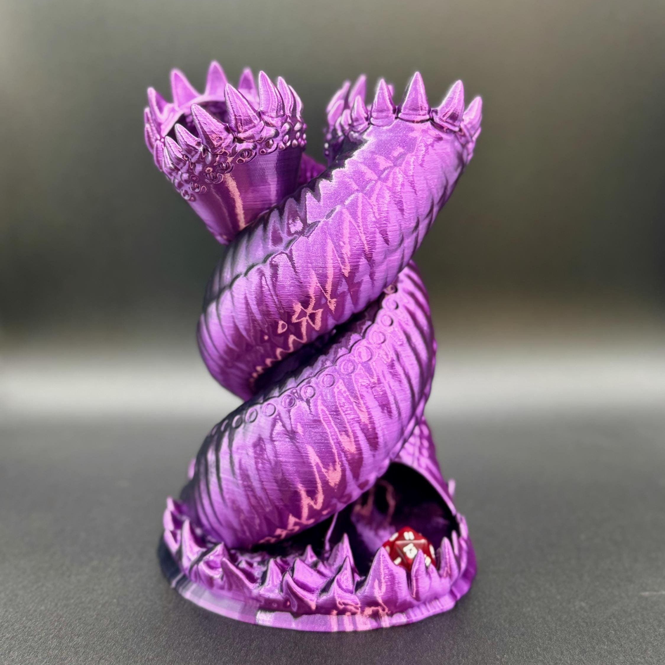 Are you tired of your dice rolling off the table? Do you want to add some excitement to your games? Look no further than our Worm Dice Towers! Perfect for Dungeons and Dragons. The Worm Dice Tower guarantees maximum randomness for your rolls. Choose from either mouth to roll your dice in to the catcher trays below and fingers cross for a 20.